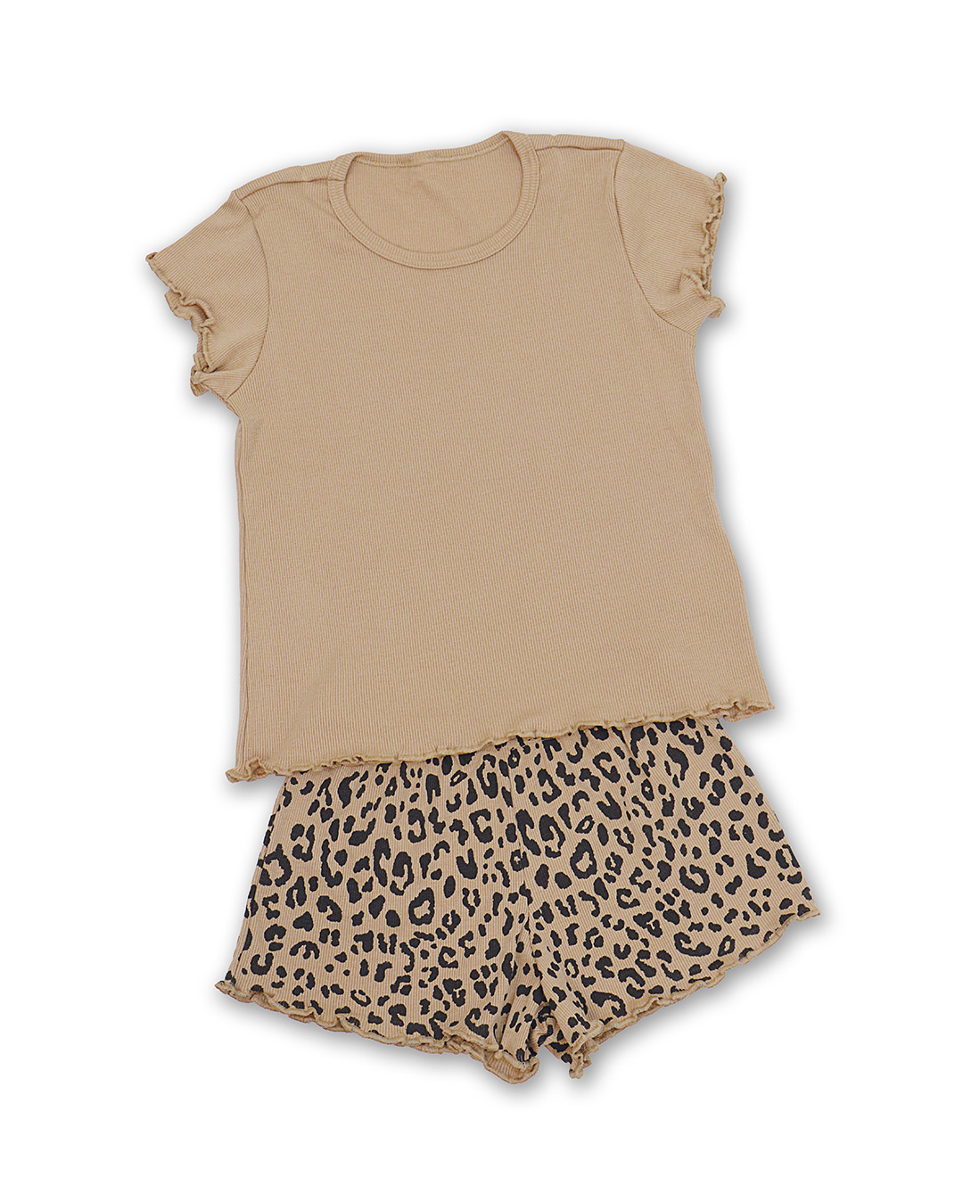Todo em ribana de poliéster, viscose e elastano.