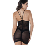 Em tule elástico transparente, com sensual drapeado na frente e nas costas.